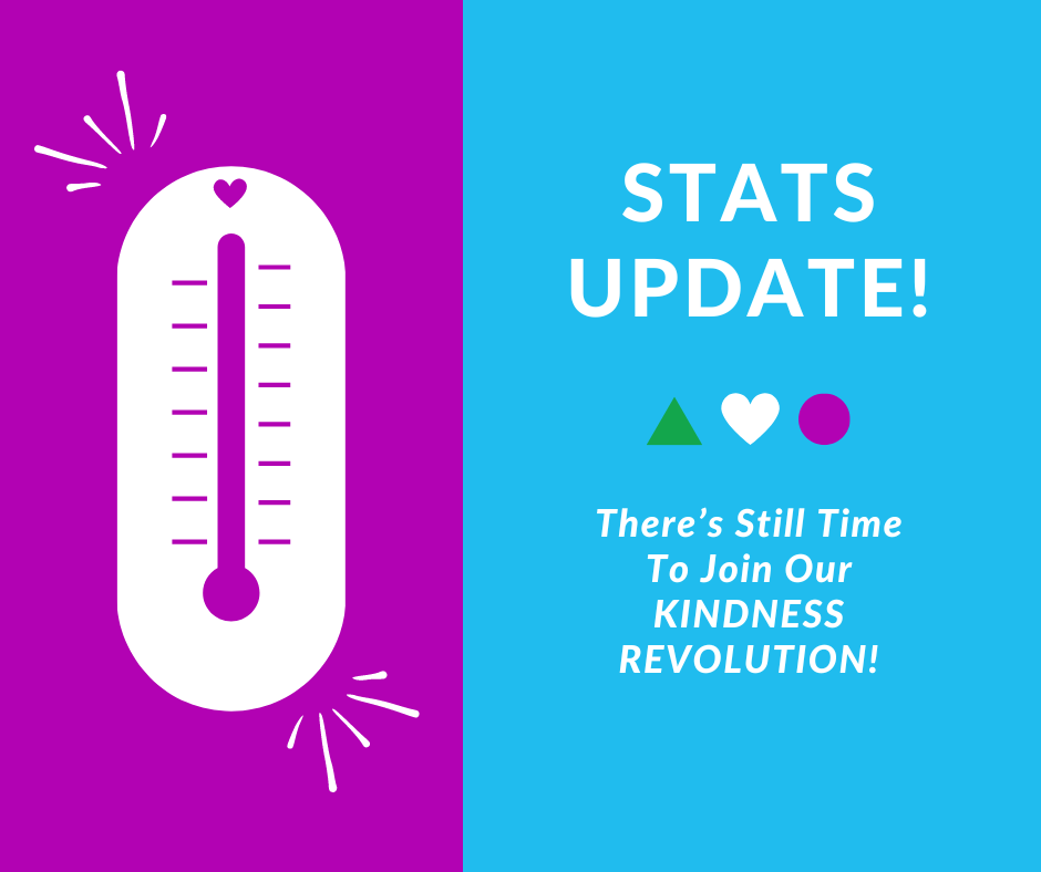 Here’s a STATS UPDATE! Join in our KINDNESS REVOLUTION!Acts of Kindness Completed: 270Money Raised: $6750.00 (Goal: $10000)Students Registered: 98Days to Go: 7See where your class is on the Raise C...